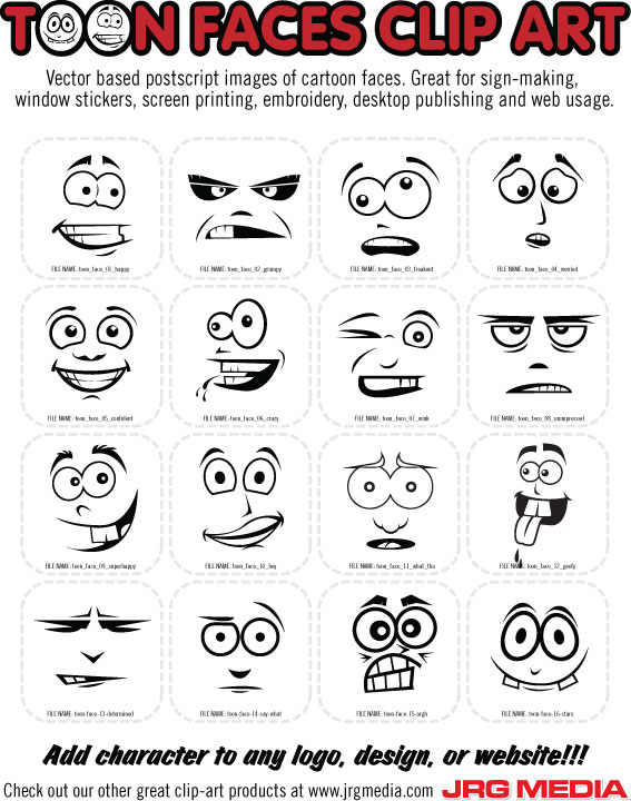 DESCRIPTION: High resolution vector clip art images of cartoon faces. 16 images ready to edit and or place in your marketing materials or on products. These images are fantastic for: signmaking, window stickers, screen printing, embroidery, engraving, ads, flyers, brochures, proposals, Tee-shirts and more! Also contains printable .pdf catalog with thumbnails of each image included with this product.