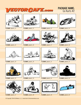 DESCRIPTION: High resolution vector clip art images of racing go karts. 20 images ready to edit and or place in your marketing materials or on products. These images are fantastic for: signmaking, screen printing, embroidery, engraving, ads, flyers, brochures, proposals, Tee-shirts and more! Also contains printable .pdf catalog with thumbnails of each image included with this product.