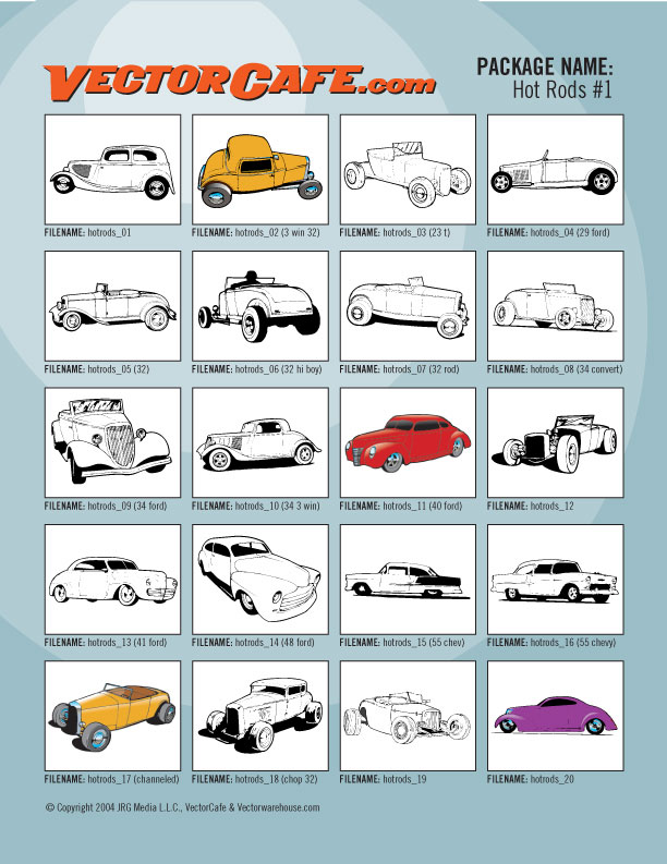 DESCRIPTION: High resolution vector clip art images of custom Hot Rods. 20 images ready to edit and or place in your marketing materials or on products. These images are fantastic for: signmaking, screen printing, embroidery, engraving, ads, flyers, brochures, proposals, Tee-shirts and more! Also contains printable .pdf catalog with thumbnails of each image included with this product.