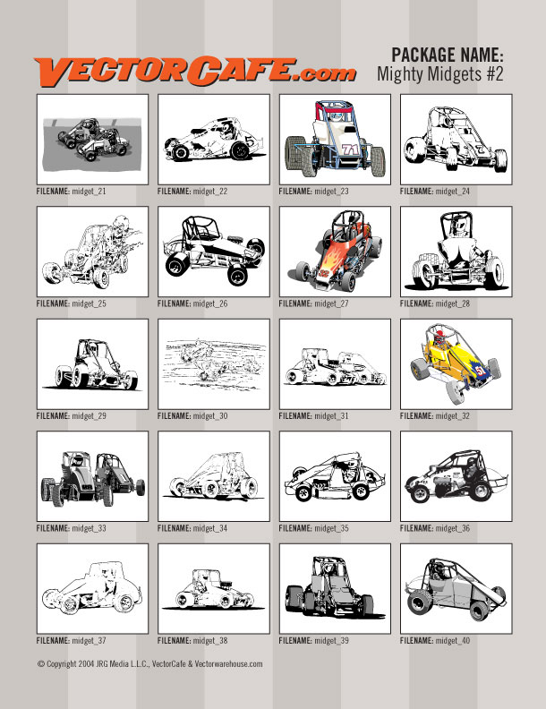 DESCRIPTION: High resolution vector clip art images of midget race cars, including pavement and dirt midgets. 20 clip art images ready to edit and or place in your marketing materials or on products. These images are fantastic for: signmaking, screen printing, embroidery, engraving, ads, flyers, brochures, proposals, Tee-shirts and more! Also contains printable .pdf catalog with thumbnails of each image included with this product.