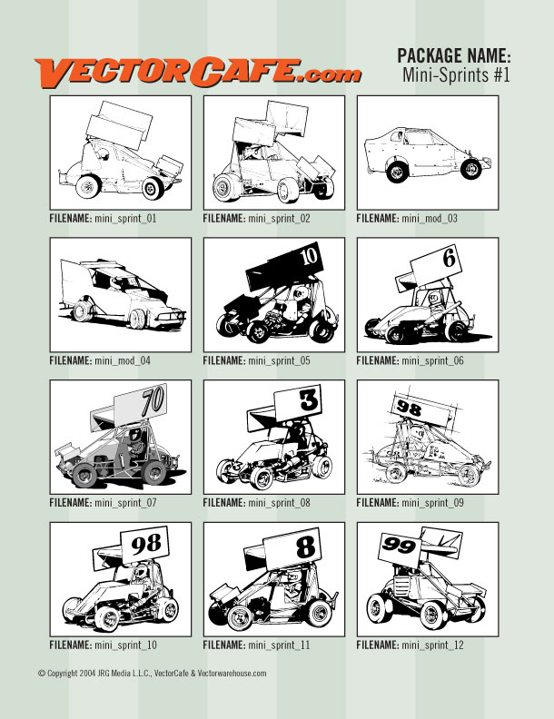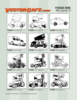 DESCRIPTION: High resolution vector clip art images of Mini Sprints and a couple of Mini Modifieds. 12 clip art images ready to edit and or place in your marketing materials or on products. These images are fantastic for: signmaking, screen printing, embroidery, engraving, ads, flyers, brochures, proposals, Tee-shirts and more! Also contains printable .pdf catalog with thumbnails of each image included with this product.