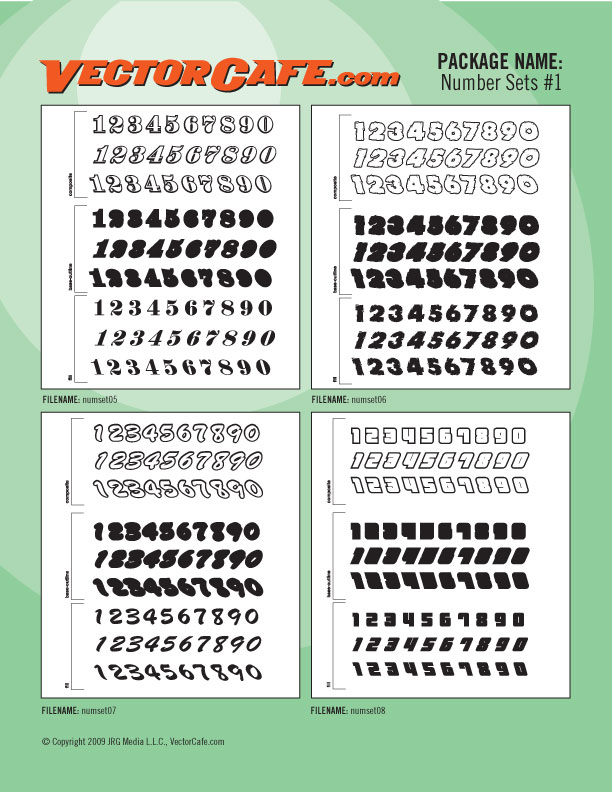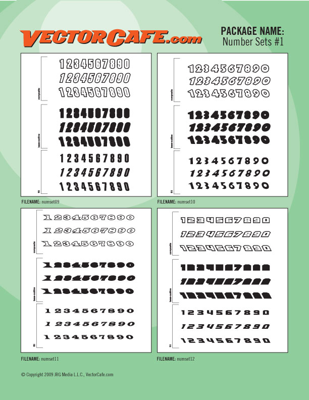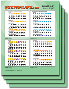 DESCRIPTION: High resolution vector clip art of different types of numbers for race car lettering. These number sets include all the parts and peices you need to make great looking numbers for race cars. 14 different styles as well as different variations of each style ready to edit print and place on race cars. These images are fantastic for: signmaking, screen printing, embroidery, engraving, ads, flyers, brochures, proposals, Tee-shirts and more! Also contains printable .pdf catalog with thumbnails of each image included with this product.