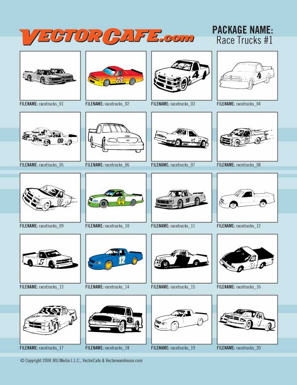 DESCRIPTION: High resolution vector clip art images of Pro Truck style racing trucks. 20 images ready to edit and or place in your marketing materials or on products. These images are fantastic for: signmaking, screen printing, embroidery, engraving, ads, flyers, brochures, proposals, Tee-shirts and more! Also contains printable .pdf catalog with thumbnails of each image included with this product.