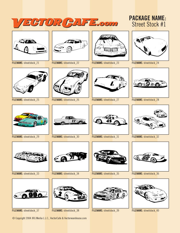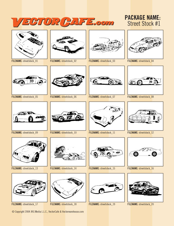 DESCRIPTION: High resolution vector clip art images of street stocks, econo stocks, enduros, super stocks and hobby stocks. 40 images ready to edit and or place in your marketing materials or on products. These images are fantastic for: signmaking, screen printing, embroidery, engraving, ads, flyers, brochures, proposals, Tee-shirts and more! Also contains printable .pdf catalog with thumbnails of each image included with this product.