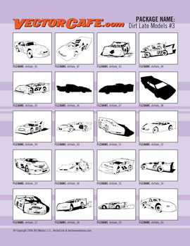 DESCRIPTION: High resolution vector clip art images of dirt late models. 20 images ready to edit and or place in your marketing materials or on products. These images are fantastic for: signmaking, screen printing, embroidery, engraving, ads, flyers, brochures, proposals, Tee-shirts and more! Also contains printable .pdf catalog with thumbnails of each image included with this product.