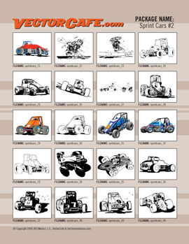 DESCRIPTION: High resolution vector images of rip snortin' sprint cars. 20 images ready to edit and or place in your marketing materials or on products. These images are fantastic for: signmaking, screen printing, embroidery, engraving, ads, flyers, brochures, proposals, Tee-shirts and more! Also contains printable .pdf catalog with thumbnails of each image included with this product.